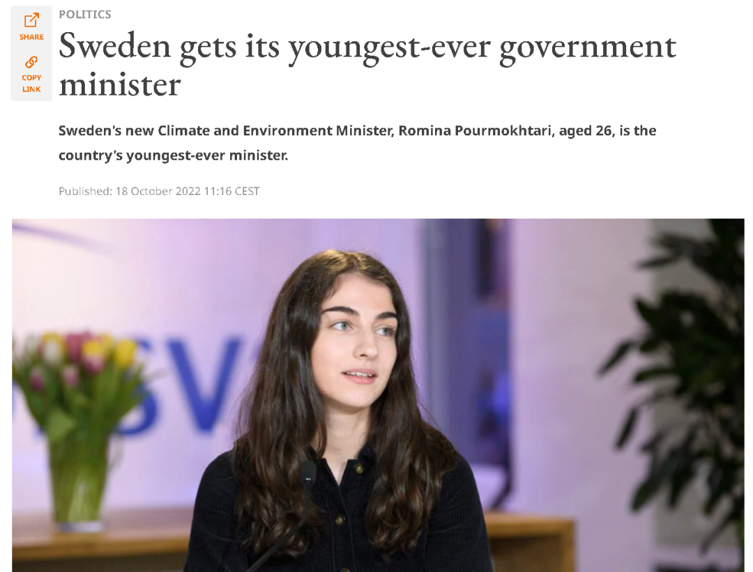 Romina Pourmokhtari a 26-year-old woman has been named climate change minister in the new Swedish government. 22 hours agoA 26-year-old has been named as climate minister by newly elected prime minister Ulf Kristersson in Sweden. Romina Pourmokhtari Minister for Climate and the Environment.